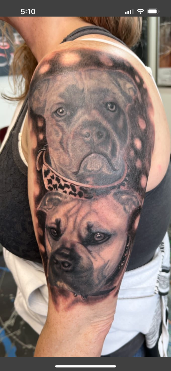 Realism tattoos including people, pets, and detailed black and grey portrait work.