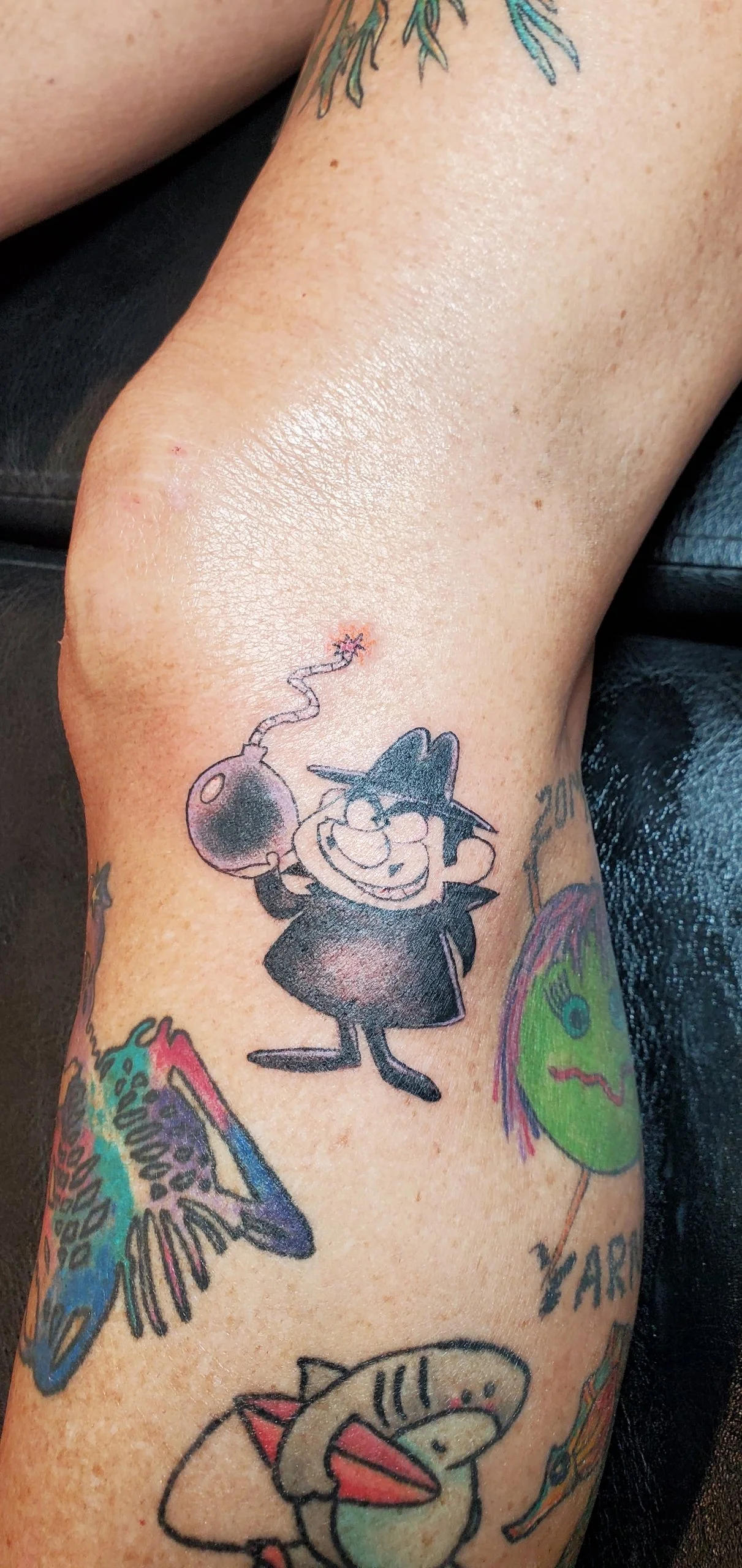 Pop culture, comic characters, anime, and graphic style tattoos with bold color.